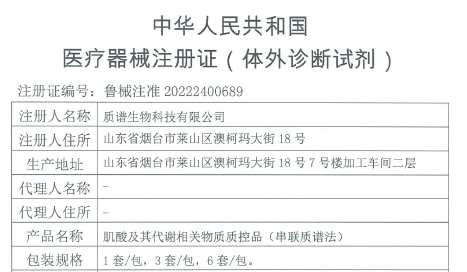 肌酸及其代谢相关物质质控品(串联质谱法)取得医疗器械注册证