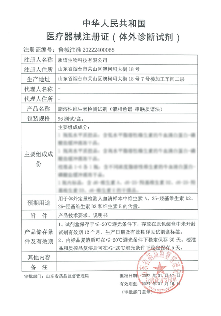 质谱生物自主研发的脂溶性维生素检测试剂(液相色谱-串联质谱法)近日取得由山东省药品监督管理局颁发的医疗器械注册证(体外诊断试剂)。